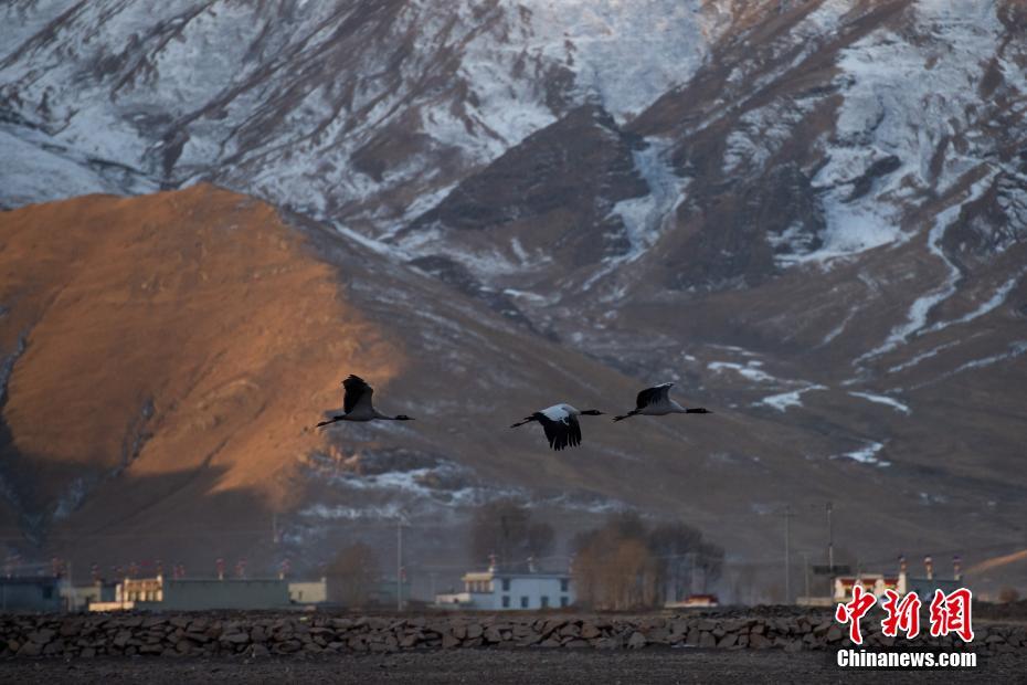 2月17日,西藏拉薩市林周縣黑頸鶴保護區(qū)內(nèi),黑頸鶴翩躚起舞、分外美麗。中新社記者 何蓬磊 攝