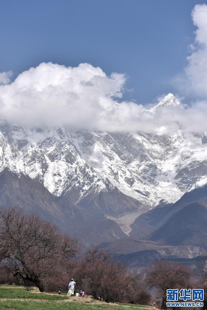 3月28日,游客在西藏自治區(qū)林芝市索松村欣賞與雪山相映的桃花。新華社記者 孫瑞博 攝