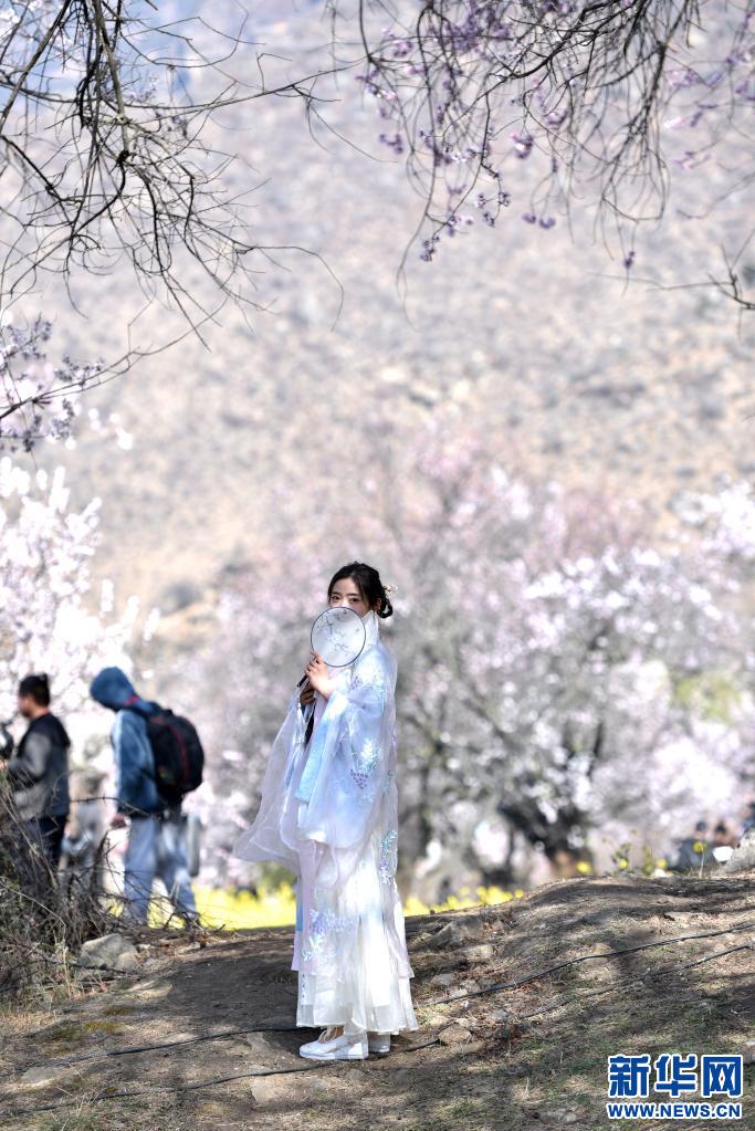 3月27日,一名姑娘在林芝市嘎拉村欣賞桃花。新華社記者 孫瑞博 攝