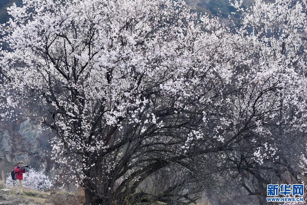 3月27日,一名游客在林芝市嘎拉村拍攝桃花。新華社記者 孫瑞博 攝