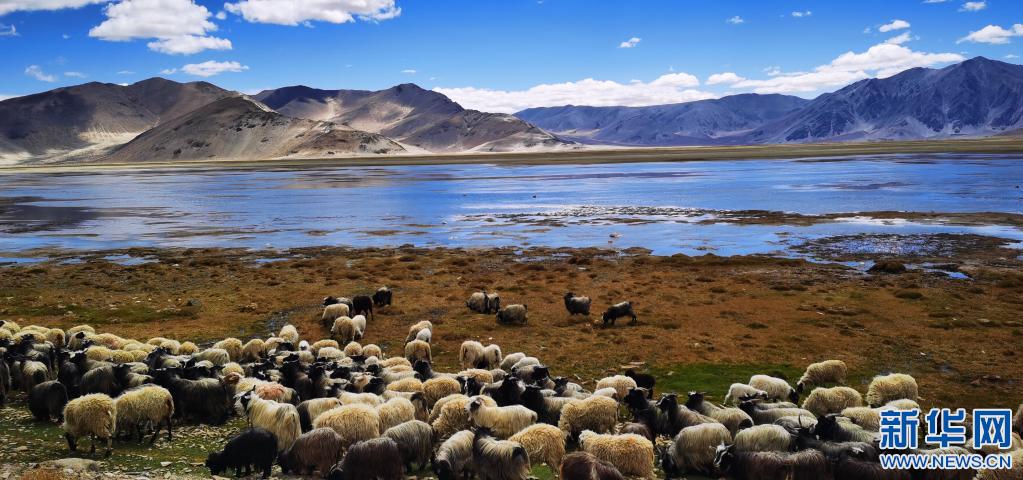 羊群經(jīng)過(guò)西藏定結(jié)縣一處湖邊的草地(5月13日攝,手機(jī)照片)。新華社記者 沈虹冰 攝