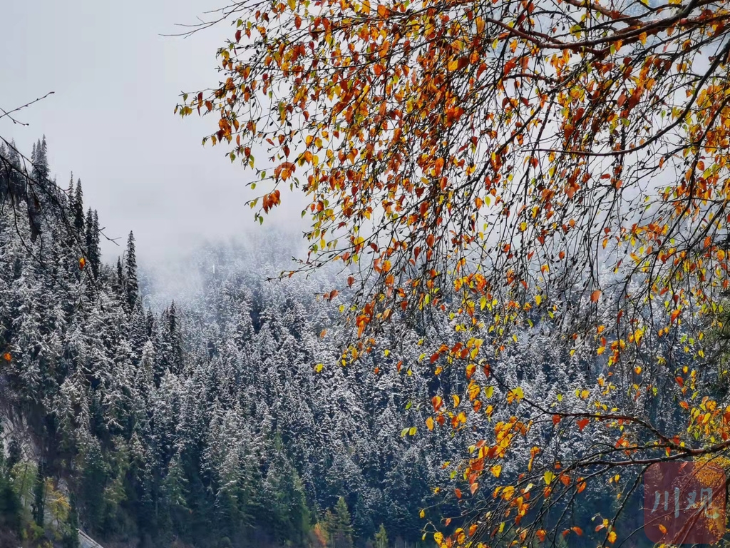 交替時(shí)節(jié),四川各地眼下已融合成了多姿多彩的天然調(diào)色盤,或是彩林錯(cuò)落,或是銀裝素裹,彩林與白雪相遇相擁,半山彩林半山雪的景致讓人無限向往。