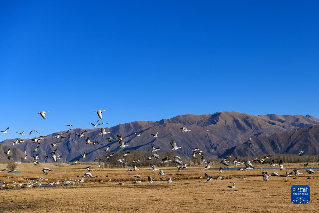 這是在唐嘎濕地拍攝的斑頭雁(12月11日攝)。新華社記者 沈虹冰 攝