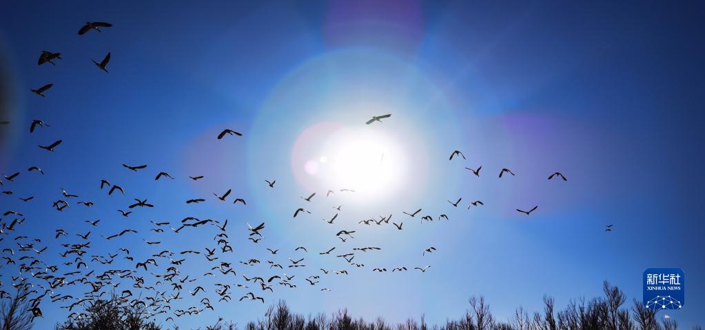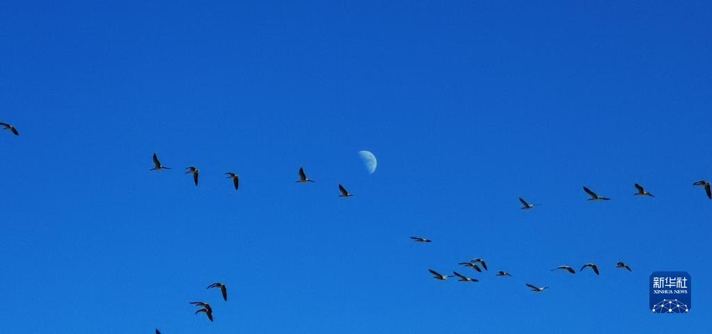 候鳥飛過唐嘎濕地(12月11日攝,手機(jī)照片)。新華社記者 沈虹冰 攝