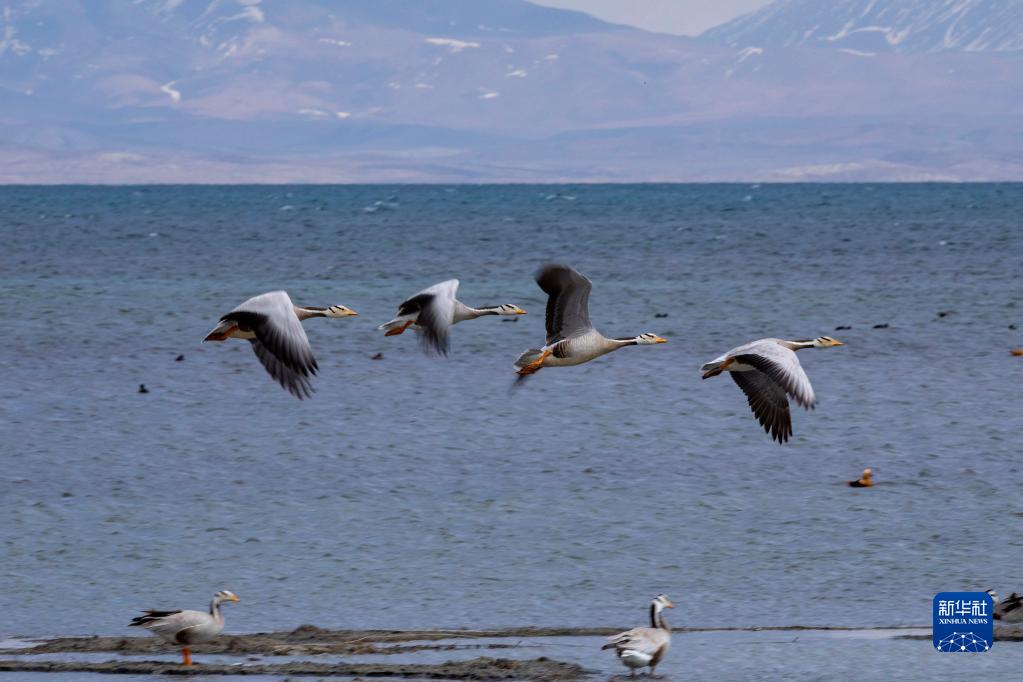 4月22日,鳥類在西藏阿里地區(qū)普蘭縣境內(nèi)瑪旁雍錯飛翔。新華社發(fā)(劉曉東攝)
