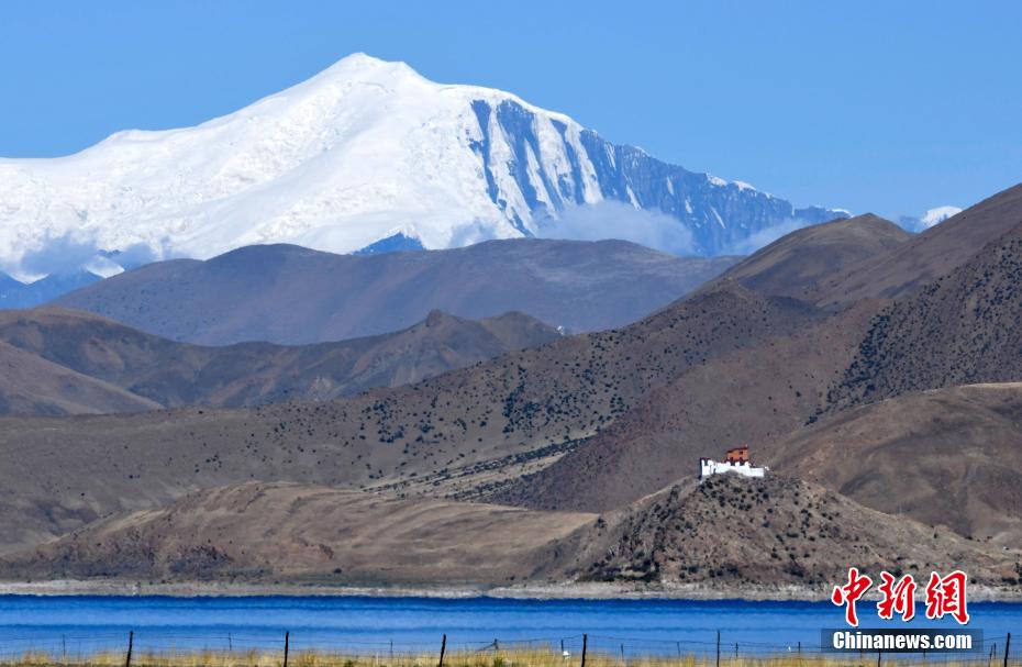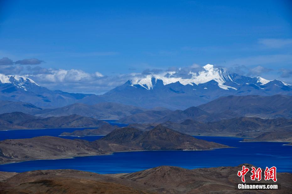 站在直拉山口俯瞰羊卓雍措,深邃藍的湖水似鑲嵌山間的藍寶石,與遠處的庫拉崗日雪山形成一幅壯美圖卷。圖為羊卓雍措。 李林 攝