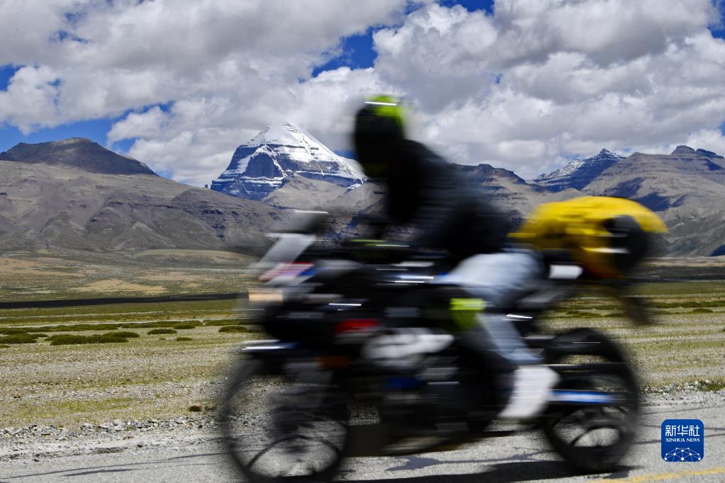 騎手駕駛摩托車經(jīng)過岡仁波齊景區(qū)(8月2日攝)。新華社記者 張汝鋒 攝