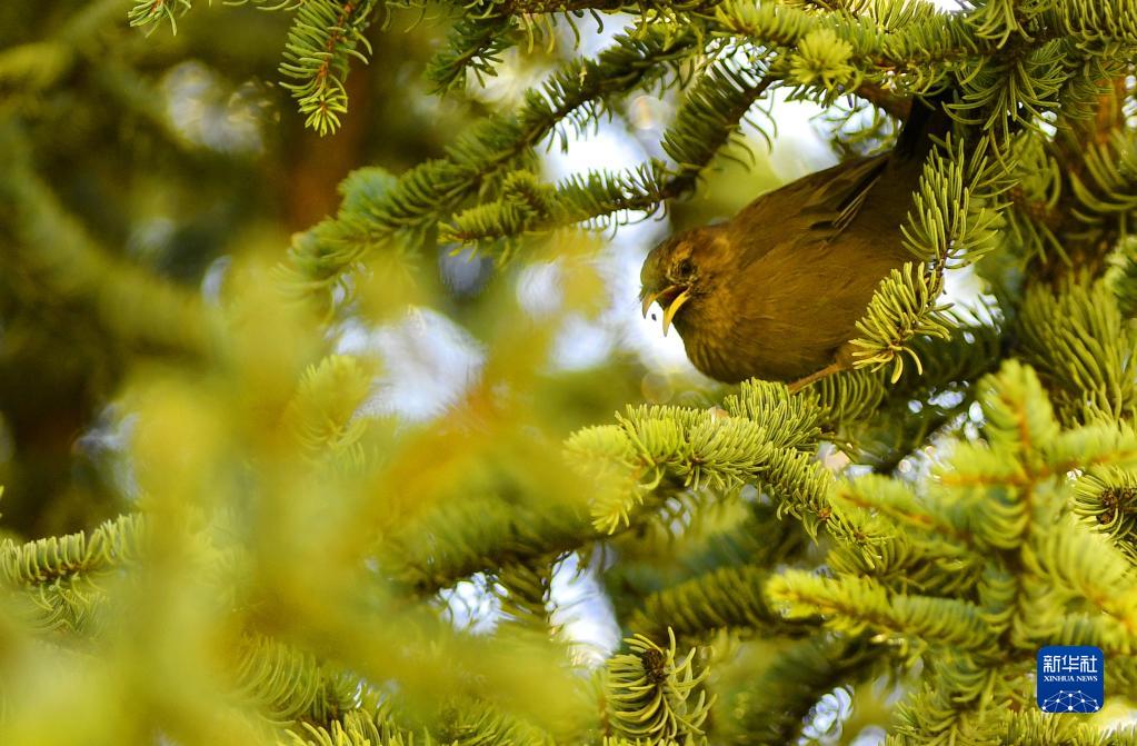山噪鹛在樹上覓食(9月21日攝)。新華社記者 張汝鋒 攝