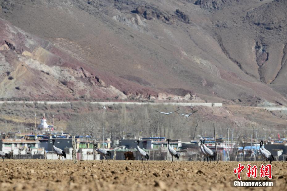 每年的10月底,成群的黑頸鶴飛到西藏拉薩市林周縣越冬,在拉薩市林周縣周邊的湖泊濕地度過5個月的“閑云野鶴”生活,次年三四月份再飛向藏北草原繁殖。黑頸鶴是世界上唯一一種高原鶴類。具有足長、喙長、頸長的典型涉禽類特征,適合在沼澤地里行走。黑頸鶴的頸、尾為黑色,體羽為灰白色。黑頸鶴是國家一級保護動物。目前,每年到林周縣越冬的黑頸鶴已達2000只左右。圖為黑頸鶴在林周境內(nèi)的農(nóng)田里覓食。 貢嘎來松 攝
