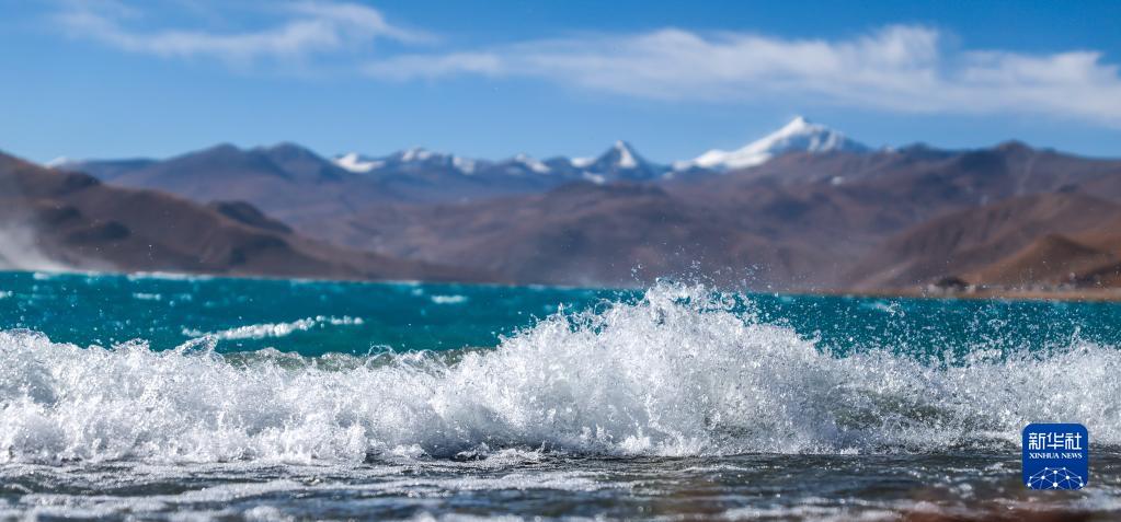 羊卓雍錯的浪花與周邊的雪山相映成趣(1月1日攝)。新華社記者 姜帆 攝