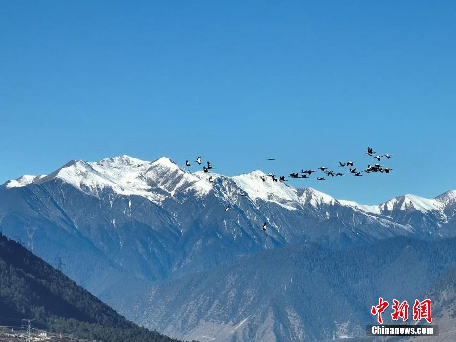 圖為黑頸鶴在雅魯藏布江上空飛舞。袁相普 攝