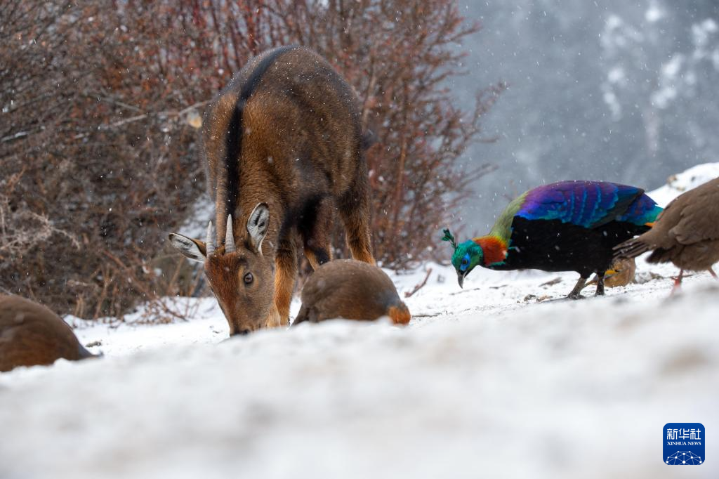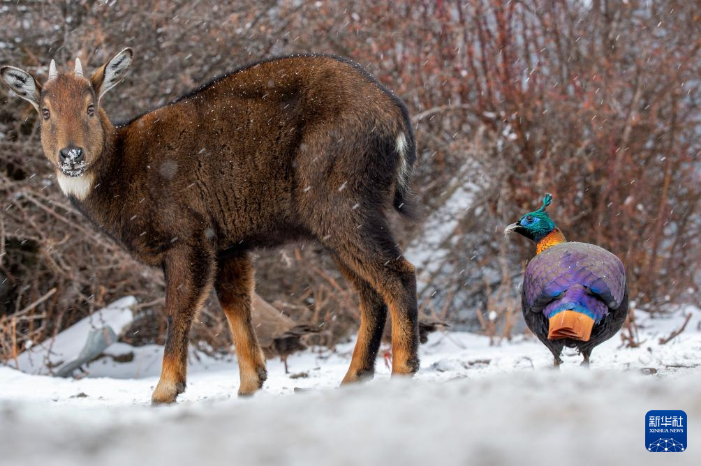 1月17日拍攝于西藏山南市洛扎縣的喜馬拉雅斑羚和棕尾虹雉等野生動物。新華社記者 旦增尼瑪曲珠 攝