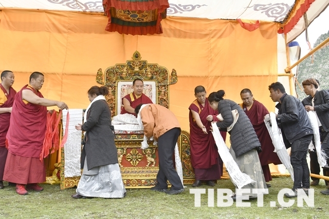 除了騎馬和騎牦牛,十一世班禪更心懷蒼生。從馬上下來(lái)后,十一世班禪為早已等候在此的信教群眾摸頂賜福。信教群眾接受了十一世班禪的摸頂賜福之后,還得到了十一世班禪的畫(huà)像、像章以及紅色金剛結(jié)。(中國(guó)西藏網(wǎng) 記者/王淑)