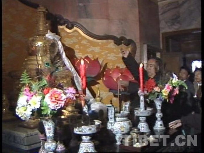 圖為1987年4月,十世班禪大師和阿沛?阿旺晉美率領(lǐng)援助西藏發(fā)展基金會籌備委員會委員朝拜靈光寺佛牙舍利塔,并親自敬獻(xiàn)哈達(dá)。