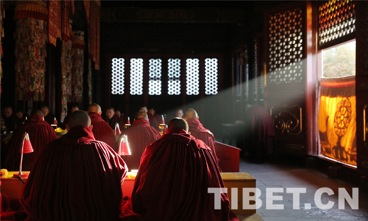 圖為僧人端坐于宗喀巴大師像兩側(cè)誦經(jīng)。