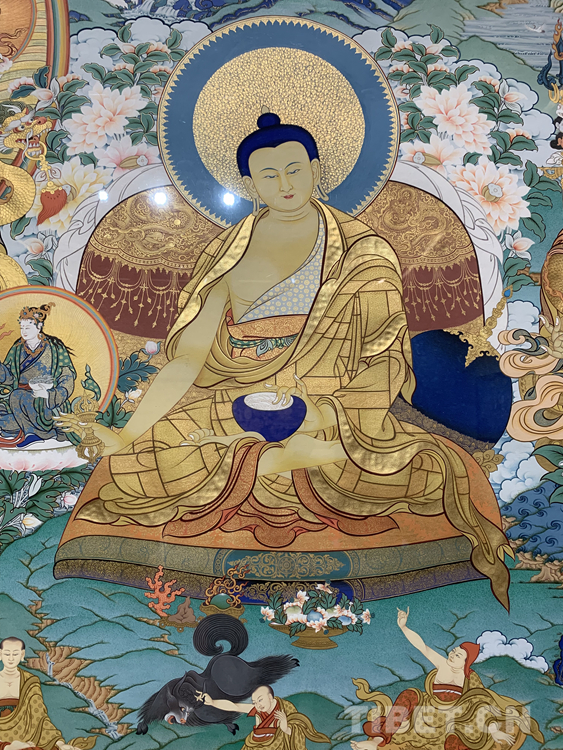 很多人對唐卡并不陌生,但對一幅唐卡是怎么被畫出來的卻是一知半解。唐卡的內(nèi)容大多來源于佛教里的經(jīng)文,里面有詳細(xì)的文字描寫,佛的穿著,顏色的搭配,甚至是佛們佩戴的首飾、拿的法器都有明確且詳細(xì)的記錄和與描寫。藝術(shù)家還需要有豐富的想象力和創(chuàng)造力,要有很強(qiáng)的構(gòu)圖能力,最重要的是要遵照《度量經(jīng)》等佛教儀軌,正規(guī)的去畫。“創(chuàng)作一幅唐卡不容易,藝術(shù)家必須要懂佛教的文化、儀軌,懂《度量經(jīng)》,再加上藝術(shù)家自己的藝術(shù)創(chuàng)造能力,才能夠畫好一幅唐卡,這需要藝術(shù)家的綜合能力?!蹦锉纠^續(xù)說:“起稿、涂色、暈染、拉金線、拉線條等每一步驟都是在考核藝術(shù)家自身的能力,藝術(shù)家自己要不斷地學(xué)習(xí):學(xué)習(xí)佛教文化,了解文化的內(nèi)涵,藝術(shù)家需要更多地把心思投入到唐卡,并提高自身的藝術(shù)造詣才能夠畫好一幅唐卡?!?/p>