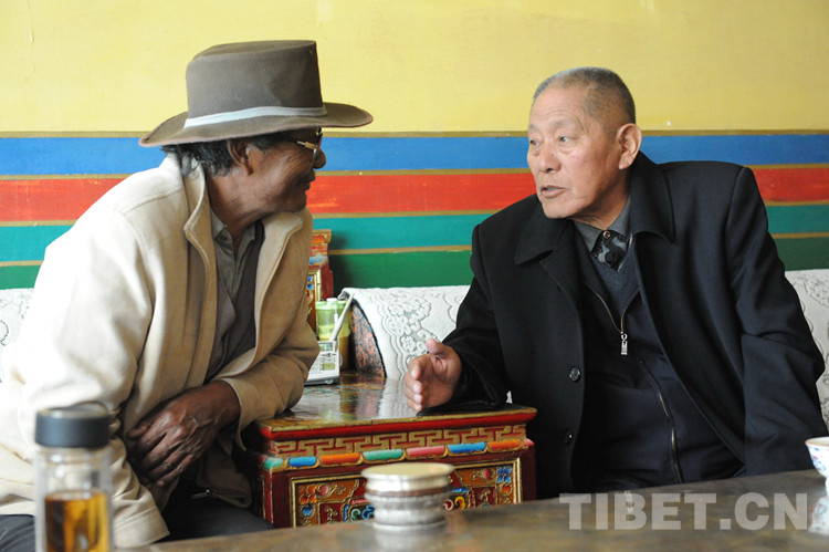 圖為當(dāng)年率領(lǐng)申扎縣牧民群眾開發(fā)藏北無人區(qū)的傳奇英雄、原西藏人大常委會副主任洛桑丹珍(右),專程來到嘎措鄉(xiāng)白瑪家中,看望當(dāng)年一同開發(fā)藏北無人區(qū)的鄉(xiāng)黨委書記白瑪(左)(2013年7月27日)攝影:唐召明