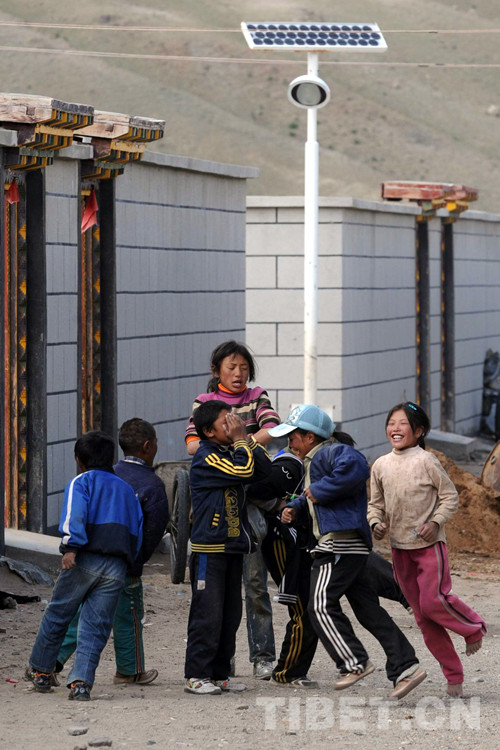 圖為暑假里,嘎措鄉(xiāng)兒童在房前玩游戲(2009年8月1日) 攝影:唐召明