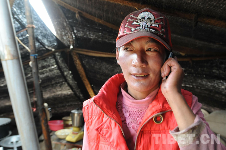 圖為嘎措鄉(xiāng)牧女頓珠卓瑪在夏季放牧點的帳篷里使用手機(jī)與家人通話報平安(2009年8月1日) 攝影:唐召明