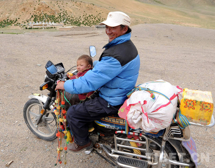 圖為一位牧民騎摩托車帶著孩子串門。目前,這個鄉(xiāng)的90多戶牧民家家戶戶都有了摩托車(2009年8月1日) 攝影:唐召明