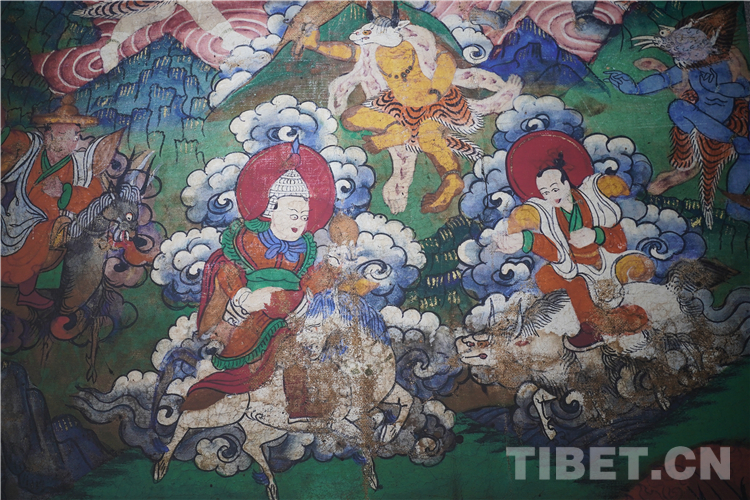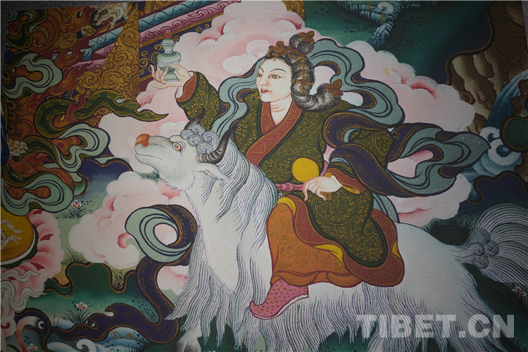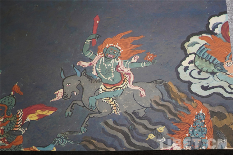 展廳中還有一副遠看非常另類,細細欣賞漢藏繪畫風格交流交融的作品,那是一幅四川省阿壩藏族羌族自治州金川縣墨爾多神山壁畫的局部作品。東智先生說:“這幅局部畫作從發(fā)髻、服飾等多個方面充滿了漢族風格,甚至人物穿的還是漢服,座下是像馬一樣的牦牛,但是手上掄著古朵(古朵指的是用牦牛毛或者山羊毛編織成的拋石繩,可以將石頭投擲到較遠的地方,是牧民們用來放牧的工具),非常有辨識度,充滿藏族文化特色。”