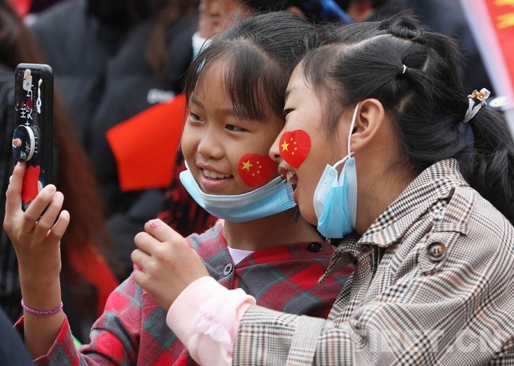 圖為在演出現(xiàn)場用手機留影的小朋友