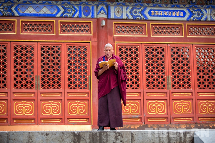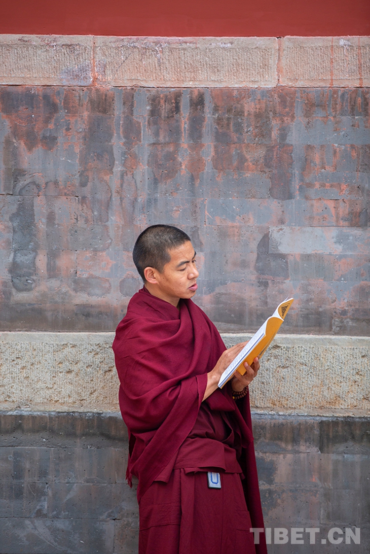 圖為即將參加2020年藏傳佛教第十六屆“拓然巴”高級學(xué)銜畢業(yè)考試辯經(jīng)考試的學(xué)僧專注誦經(jīng) 攝影:許娜