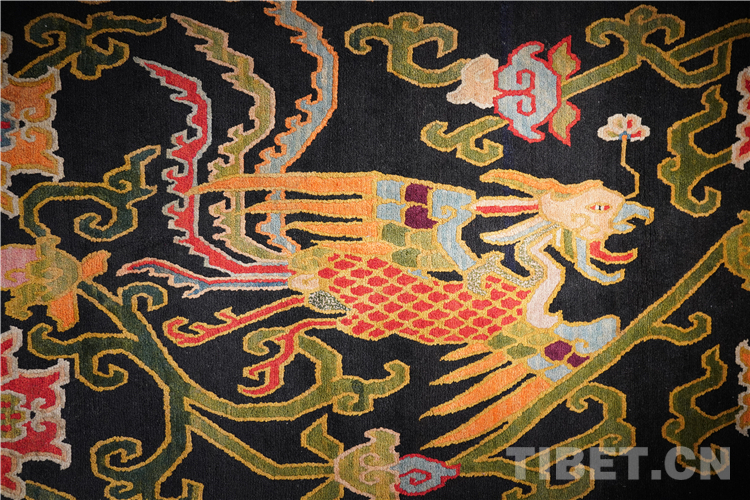 “本次展覽的藏毯,色彩搭配和編織都是技藝一絕,尤其是圖案寓意深遠(yuǎn),最具特色的是龍身鳳尾的龍鳳呈祥花紋非常精美。”介觀藝術(shù)中心的創(chuàng)始人徐應(yīng)龍介紹,“上半身為龍身,下半身為鳳尾,體現(xiàn)了多民族的文化交往交流交融。”
