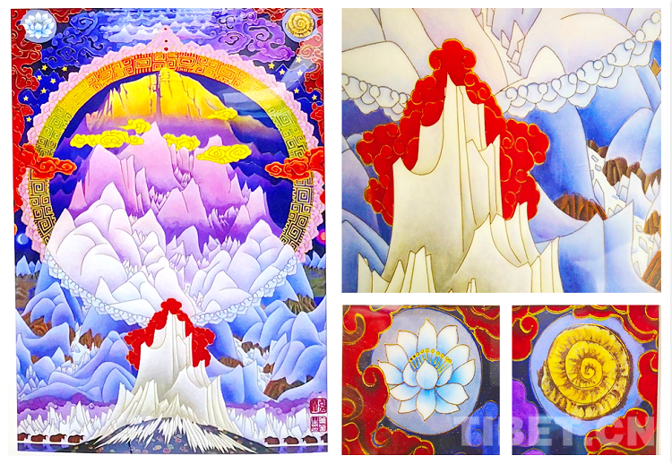 而令葉星生深受觸動(dòng)的,是十世班禪大師對(duì)創(chuàng)作的關(guān)心、前衛(wèi)的創(chuàng)作思路和嚴(yán)格的要求?!笆腊喽U大師多次提出指導(dǎo)意見,鼓勵(lì)我們大膽創(chuàng)新,要融入光影等繪畫新技法及漢族傳統(tǒng)繪畫技法,使珠峰更有立體感,使畫作成為現(xiàn)代藝術(shù)技法與藏族傳統(tǒng)繪畫手法相融合的代表,成為民族團(tuán)結(jié)的象征。所以,這幅畫在結(jié)構(gòu)上參考了唐卡,比如彩虹;祥云、太陽、月亮、星斗對(duì)稱的方式等來自西藏傳統(tǒng)壁畫藝術(shù);但在光線、明暗對(duì)比等方面加入了漢地工筆重彩,甚至西方的藝術(shù)手法。在天地之間以更加立體的視角展現(xiàn)出了珠峰壯麗雄偉的全景?!?/p>