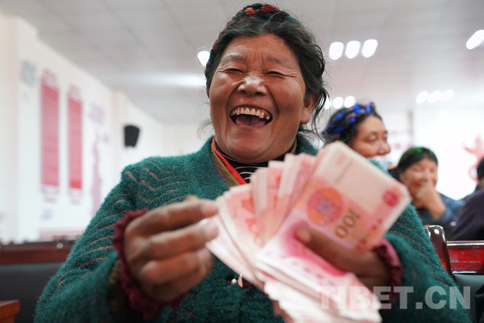 令人激動的時刻來臨了。“二組索朗曲珍,分紅26739元;二組支張,分紅6495元;一組朗杰曲珍,分紅2668元……”社員們?nèi)讲⒆鲀刹?,滿臉喜滋滋地依次上臺接過沉甸甸的分紅。他們在分紅發(fā)放清單上填上名字,摁上手印后,喜笑顏開地數(shù)著手里的錢。