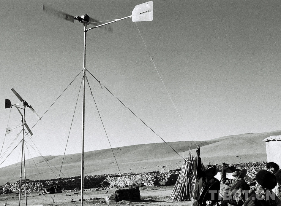 圖為那曲風能實驗站技術(shù)人員為雙湖辦事處(現(xiàn)改為雙湖縣)嘎措鄉(xiāng)牧民檢修保養(yǎng)所安裝的風力發(fā)電機 唐召明1988年攝