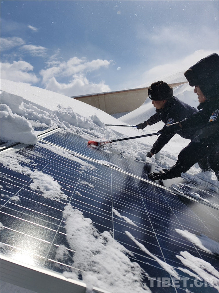 圖為民警們?cè)?019年春節(jié)前遭遇暴雪時(shí)清理太陽(yáng)能電池板上的積雪