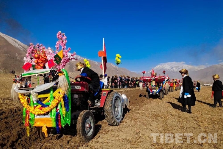 上午10點左右,拉薩市達孜區(qū)白納村七組田地里的拖拉機已整齊排列。身著盛裝的拖拉機手們登上拖拉機,號令一響,田野間充盈著“突突”聲。隨著拖拉機在田地里翻出的一壟壟土地,青稞等種子也隨即被播撒。
