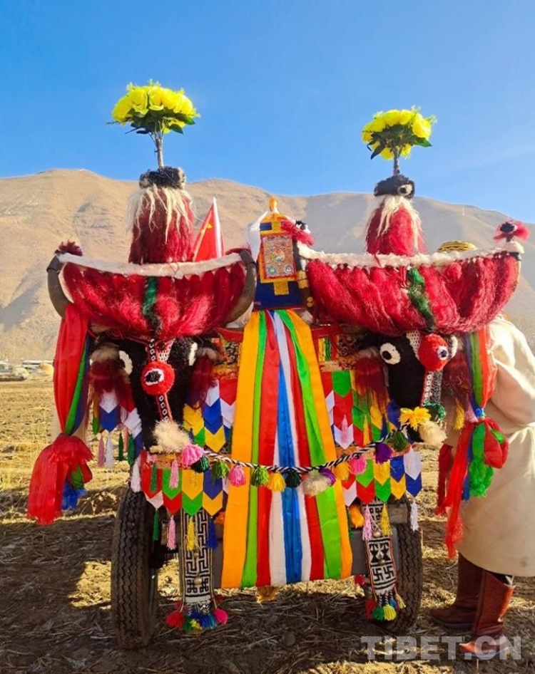 圖為拉薩市達孜區(qū)白納村春耕儀式上裝扮一新的“鐵牛” 攝影:卓嘎
