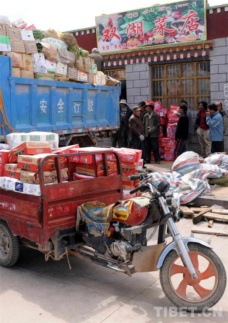 這是雙湖特別區(qū)(現(xiàn)為雙湖縣)的“雙湖菜店”正在準(zhǔn)備把包車運來的蔬菜等物品卸貨(唐召明2009年8月攝)