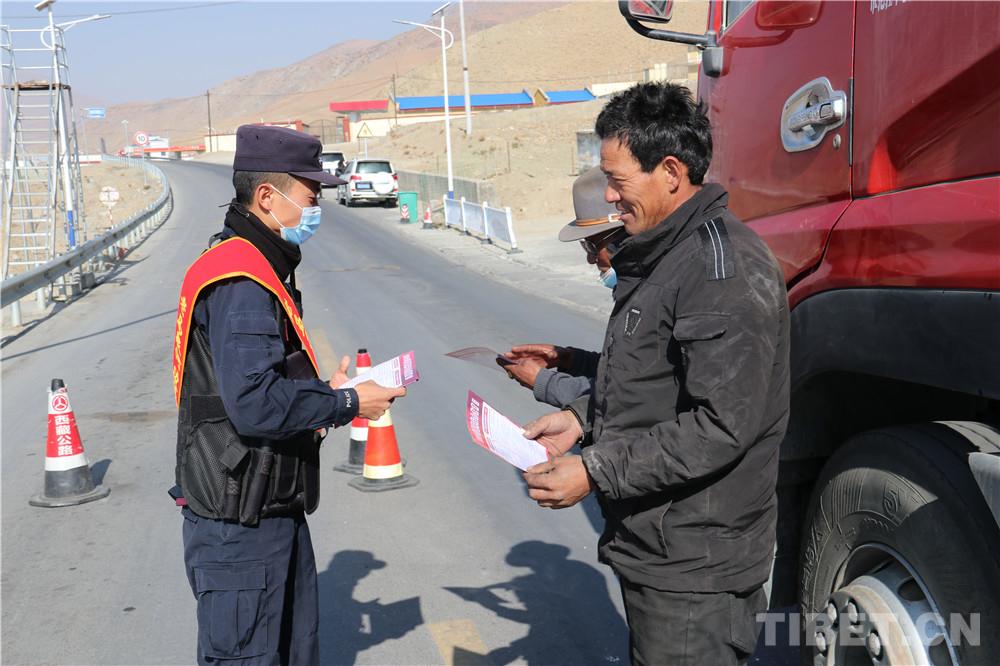 圖為老馬泉河邊境檢查站民警向過往司機(jī)發(fā)放宣傳單。李坤攝
