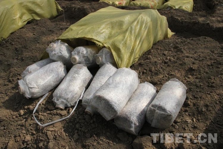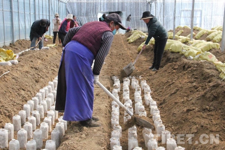 圖為尼瑪指導(dǎo)村民種植靈芝菌包
