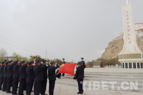 圖為康馬邊境管理大隊民警在江孜宗山英雄紀念碑前重溫入黨誓詞 楊朝祥 攝