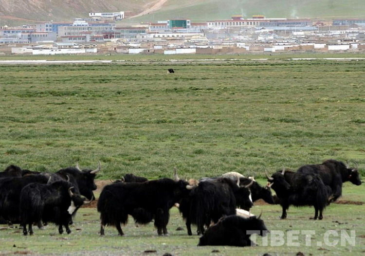 這是遠眺申扎縣城新貌,前景是放牧的牛群(唐召明2009年攝)