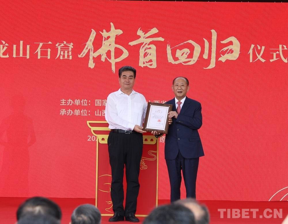 儀式上,國家文物局政策法規(guī)司司長陸瓊向天龍山石窟博物館館長于灝頒發(fā)文物入藏清冊。太原市委副書記、市長張新偉向佛首捐贈人張榮頒發(fā)“榮譽(yù)市民”證書。張榮表示將太原市政府頒發(fā)的獎(jiǎng)金捐出,用于支持文物追索返還工作。