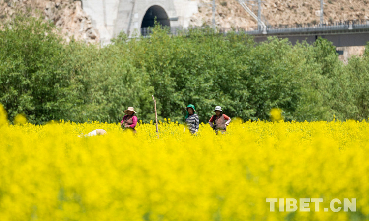 圖為西藏山南在油菜花田中勞作的群眾 攝影:趙耀