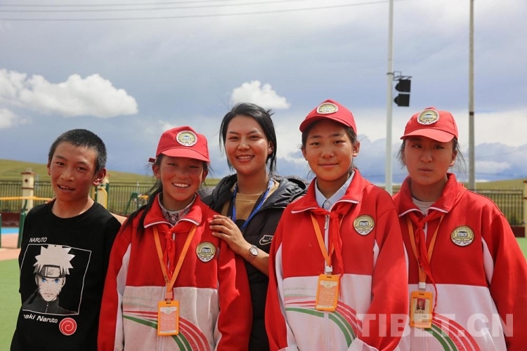 圖為西藏自治區(qū)那曲市色尼區(qū)杭嘉中學(xué)英語(yǔ)老師旦增卓瑪(左三)與學(xué)生們合影 攝影:吳建穎