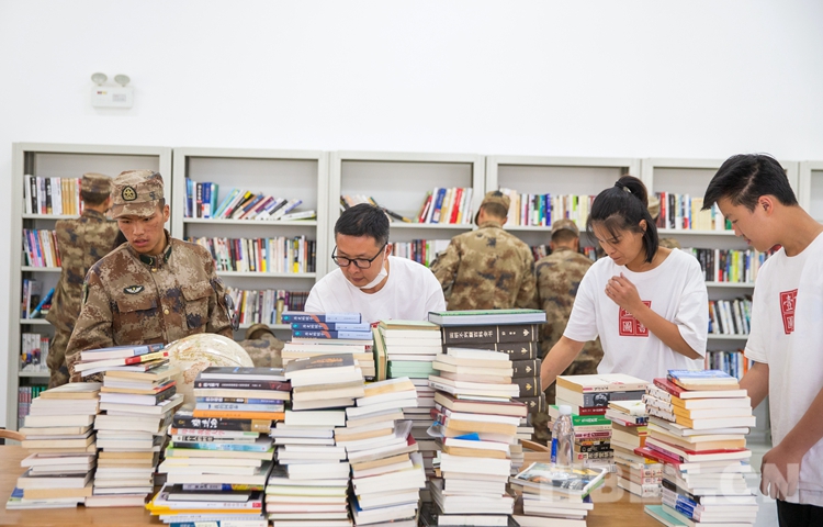 圖為志愿者與官兵一同分類書籍