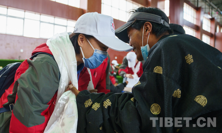 圖為嘎瑪措姆家鄉(xiāng)群眾向郭梅(左)敬獻(xiàn)哈達(dá) 攝影:趙耀