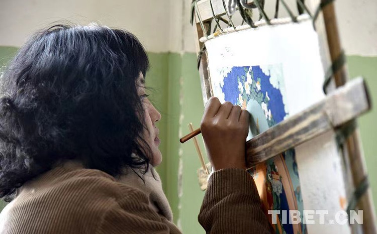 圖為西藏唐卡畫院學徒正在繪制唐卡