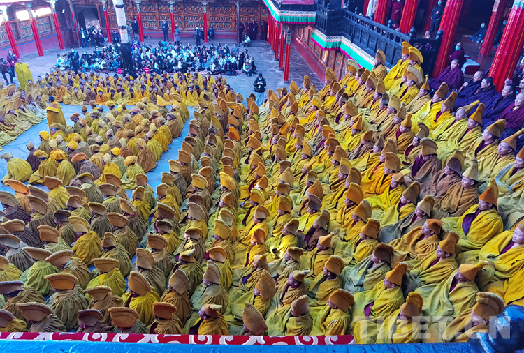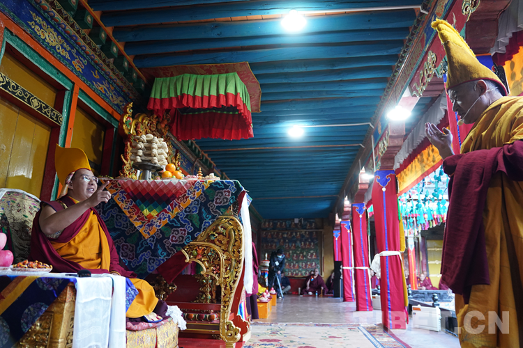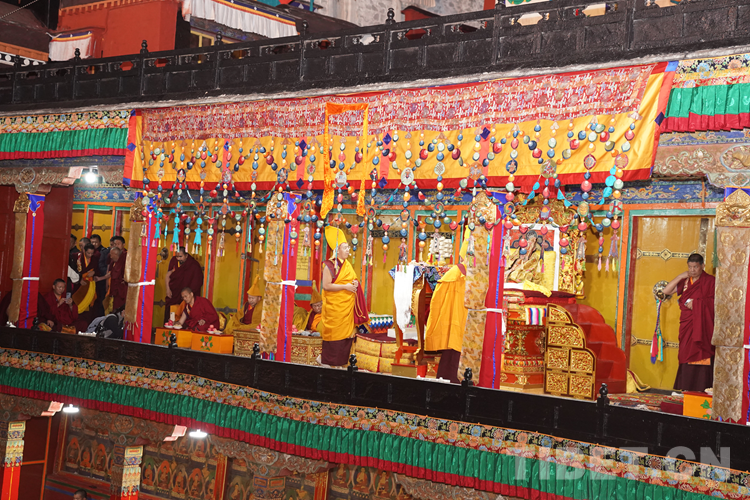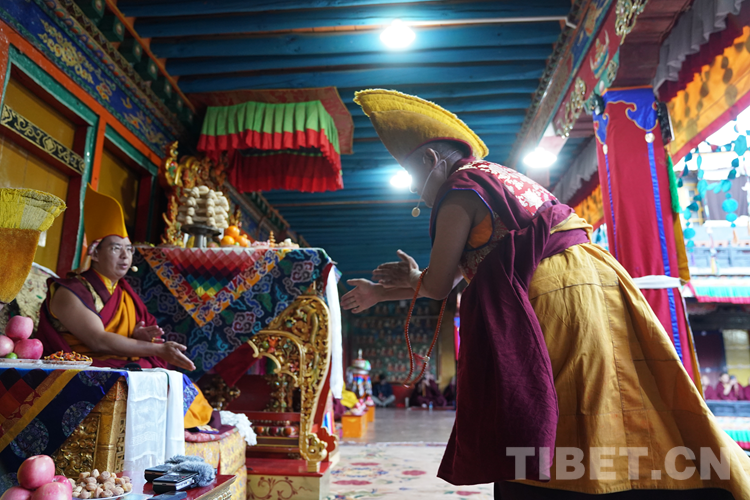 經(jīng)過數(shù)日準(zhǔn)備,26日下午,班禪于扎什倫布寺參加嘎欽學(xué)位立宗答辯。來自西藏自治區(qū)藏傳佛教各教派的堪布、經(jīng)師等高僧以及扎什倫布寺僧眾、信教群眾等800人共赴盛會(huì)、共享法喜。