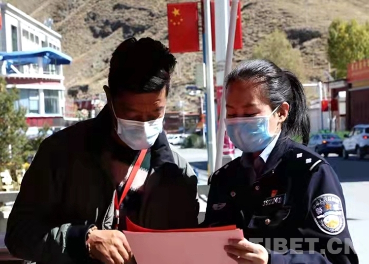 “出家門,戴口罩,少聚會,少串門,非常時期要留神。勤洗手,講衛(wèi)生,室內(nèi)開窗多通風(fēng)。舊口罩,要收起,有害垃圾要處理……”民警珠央正在使用漢藏雙語向駐地群眾宣講防疫口訣。