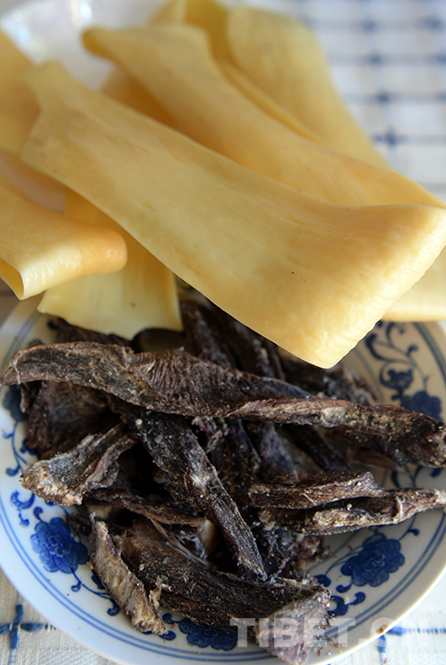 在藏北,常見的傳統(tǒng)風干牦牛肉是不加任何佐料的,為的是讓肉保持最純粹的原味。每年進入11月底,藏北已是天寒地凍,牧民們先將新鮮牦牛肉切成條型狀,然后掛在通風處晾起來,使之冰凍風干,自然脫去水分。第二年3月后取下生吃即可,味道十分鮮美。