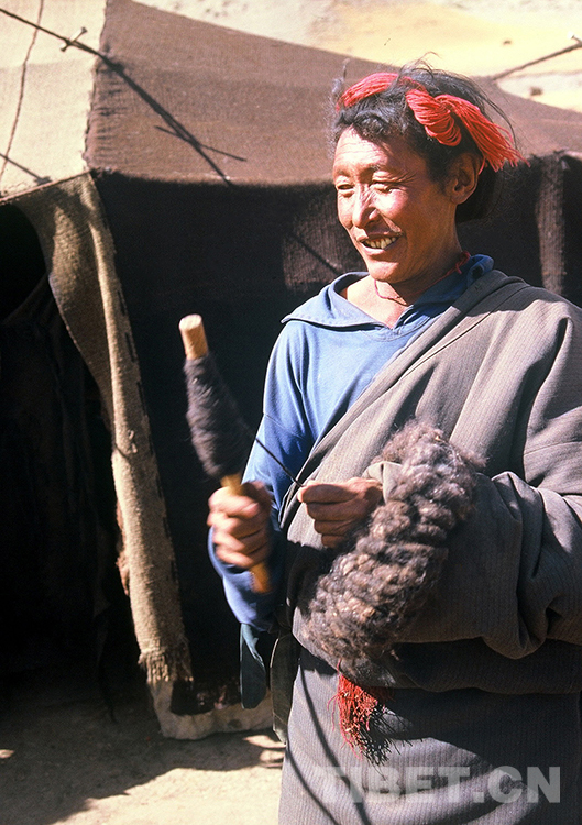 這是一名牧民男子在家中帳篷前捻用來織帳篷的牦牛線。過去牧民逐水草而居,住的是可以隨時拆遷的牛毛帳篷。如今,大多數(shù)牧民已住進寬敞明亮的安居房,已很少自己捻毛線來織帳篷了(唐召明1987年攝)