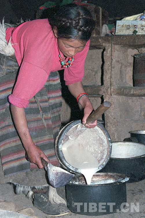 這是那曲地區(qū)(現(xiàn)那曲市)班戈縣牧女正在倒用木桶打過的牦牛奶,準備熬制酥油(唐召明1987年攝)